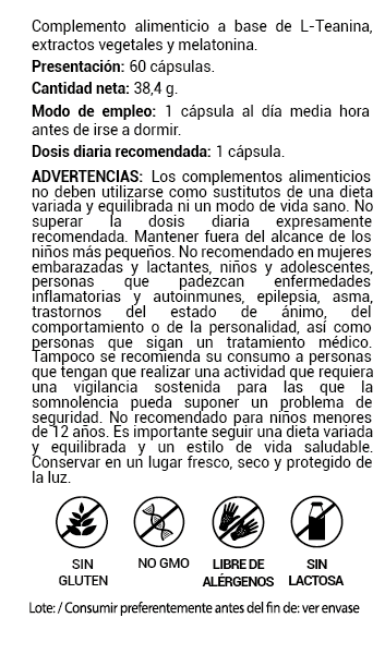 • Complemento alimenticio a base de L-Teanina, extractos vegetales y melatonina.